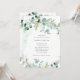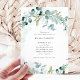 This trendy bridal shower invitation features elegant watercolor eucalyptus greenery, with plenty of foliage, green leaves, and branches. They decorate a simple white background with classic modern text and subtle watercolor splashes.