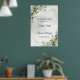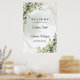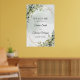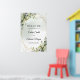 Simple boho design for wedding welcome sign aisle poster features lavish watercolor green eucalyptus leaves mixed greenery foliage woven into faux gold frame. Elegant script typography.