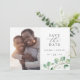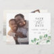 This elegant greenery photo save the date card is perfect for a simple wedding. The modern elegant design features a natural botanical arrangement of eucalyptus, leaves and plants with a subtle mint green watercolor wash accent.