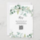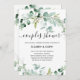 This trendy couples wedding shower invitation features elegant watercolor eucalyptus greenery, with plenty of foliage, green leaves, and branches. They decorate a simple white background with modern script typography. The back of the card has a spot for a scannable QR code so guests can easily rsvp. The perfect way to invite friends and family to celebrate!