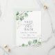 This elegant greenery save the date announcement card is perfect for a simple wedding. The modern elegant design features a natural botanical arrangement of eucalyptus, leaves and plants with a subtle mint green watercolor wash accent.