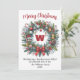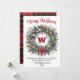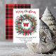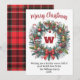 elegant greenery wreath Christmas non-photo Holiday Card, red plaid background in the back, you can personalise your family name, with a sceipt greeting message, it's a great gift to your family on this special day.