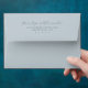 This elegant envelope features a minimalist design with a clean, white background and dark grey text. The layout is centred, showcasing an elegant cursive script for names followed by a classic serif font for the address, creating a sophisticated and formal appearance. With ample negative space, the design emphasizes clarity and readability, making it perfect for official or ceremonial occasions. Its understated style blends traditional elegance with contemporary minimalism, ideal for those seeking a refined and functional envelope.