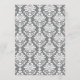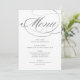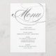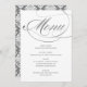 Elegant and formal white wedding dinner menu cards feature dark charcoal grey calligraphy script and damask pattern on the back of the card.