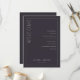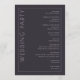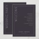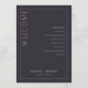 This elegant wedding program features a minimalist design with a dark grey background and clean, modern typography. The layout is vertically orientated, divided by a thin white line, creating two sections: one for the welcoming "WELCOME" in large serif font and another listing ceremony events in a centred sans-serif style. Customisable placeholders allow for personalisation with names and dates, making it perfect for formal celebrations. The overall mood is sophisticated and anticipatory, ideal for a memorable event.