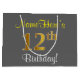 This simple, elegant birthday gift bag design features a personalised message like "NameHere’s 12th Birthday!" (with the "12th" having a faux/imitation gold-like colouring look) on a grey coloured background. The name is in script-like, yellow-coloured text, and can be personalised. A personalised birthday gift bag like this could perhaps be used when giving a present or gift to somebody who is celebrating their twelfth birthday. [~Z0000261]