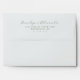 This wedding envelope features a clean, minimalist design with an elegant cursive script for names and a simple serif font for the address details. The layout is centred on a plain white background, creating a balanced and sophisticated look. With its dark grey or soft black colour palette, it offers a subtle contrast that enhances readability without overwhelming the eye. Perfect for formal invitations, this design exudes calmness and timelessness, making it ideal for couples seeking a refined and understated aesthetic.