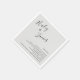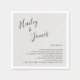 Simple wedding napkins with your names in an elegant handwritten script at the top left and a list of fun facts about you over a light grey / silver toned background. The chic hand lettering adds a romantic touch to this minimalist design.