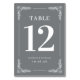 This elegant wedding table card features a symmetrical layout with a muted grey background, creating a sophisticated and classic look. The design highlights a large numeral "12" in bold white serif font at the centre, surrounded by delicate leaf-like motifs that add an organic touch. Customisable text fields allow for personalisation with names and dates, making it perfect for formal events like weddings. The clean lines and balanced composition convey a mood of refinement and formality, ideal for enhancing your special day's ambiance.