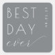 This wedding sticker features a minimalist design with a solid grey background, creating an elegant and modern look. The text "BEST DAY ever" is prominently displayed in clean sans-serif and cursive fonts, conveying a joyful and celebratory mood. Negative space enhances the simplicity of the layout, allowing each element to stand out distinctly. Perfect for adding a touch of sophistication to your special day, this sticker combines understated style with customisable date options for personalisation.