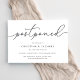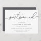 Need to postpone your wedding or change the date? Let guests know with these simple and elegant wedding postponement announcement cards. Chic grey and white design features "postponed" at the top in hand lettered calligraphy script, with your names and new date beneath. Adjust the wording and level of detail as needed. As shown, sample text directs guests to your wedding website for additional information.