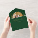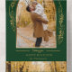 This chic and understated design features a gold gradient arch-shaped photo template surrounded by gold hand drawn holly on a dark hunter green background. Includes editable text fields. The panels feature complementary graphics, additional text fields and a bonus tearaway photo template.