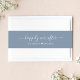 Elegant dusty blue wedding invitation set belly band featuring "happily ever after" in a chic white calligraphy script with swashes and your names joined together with a heart.