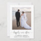 Elegant and chic elopement or smaller wedding announcement and post-wedding reception or party invitation. The front features your photograph, "happily ever after" written in a stylish script with swashes and your first names, wedding date and location. On the reverse side, you can personalise your wedding announcement in more detail, add a reception or party invitation and sign your married names in a signature-like script.