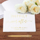 Elegant white wedding guest book featuring your choice of real gold, silver or rose gold foil, "Happily Ever After" in a mix of simple typography and a chic script with swashes, your names joined together by a heart and your wedding date. Personalise additional text on the spine and the back.