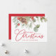 Send festive holiday greetings to your family and friends with this Elegant Holly Berries and Pine Cone Christmas card. This non-photo Christmas card features painted red holly berries and pinecones with lush green leaves bordering the top of the design. "Merry Christmas" is displayed in a festive red calligraphy script with your name or custom text shown below. The rustic Christmas card reverses to display your personal message in white lettering with a red background.