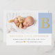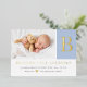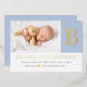 Elegant minimalist real foil initial block letter on baby blue with newborn boy photo baby birth announcement. Personalise this by adding your own photo and details to make it special and your very own.