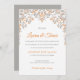This unique vintage wedding invitation features a one-of-a-kind ornate design at the top. The grey is set in the design, but you can change the orange colour to anything you like just by changing your background colour!