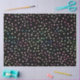 A magical girly Disco Party holographic confetti iridescent dots Black artwork, perfect for special events, party decorations, and unique celebrations. Featuring a collection of shimmering faux glitter sparkles, holographic polka dots in pink, purple, mint, green, blue, teal, yellow pastel colours, metallic gradient effects brush dots pattern, on a black background.