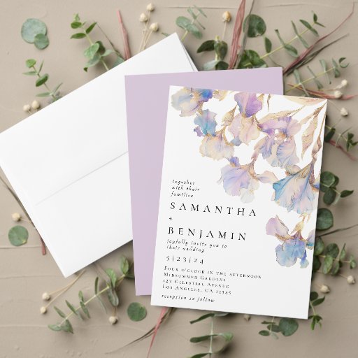 This elegant wedding details enclosure card is perfect for spring and summer weddings. This design features watercolor irises in shades of lilac and periwinkle blue. Subtle touches of gold add a glistening, magical element.