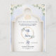 Celebrate your special day with grace and tradition using this beautifully crafted Islamic wedding invitation card. The design features elegant Arabic calligraphy of “Bismillah ir-Rahman ir-Rahim”, framed in a delicate mosque-style arch with soft floral accents and gold details.