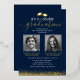 Modern double graduation invitations featuring a stylish navy blue background that can be changed to any colour, elegant gold glitter, mortarboards, photos of the two graduates, and a double celebration template using real gold foil (can be changed to silver or rose gold).