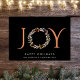 Elegant corporate holiday greeting card featuring the word "JOY" in stylish terracotta typography with the "O" depicted by a watercolor wreath, all against a black background. You can personalise the "Happy Holidays" greeting, your business name and a message inside.