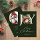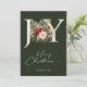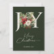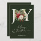 Celebrate the magic of the season with this elegant Christmas card featuring a classic “JOY” design adorned with lush winter florals and festive greenery. Set against a rich forest green background, this timeless card brings warmth and sophistication to your holiday greetings.