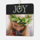 Festive "Joy" typography with faux eucalyptus wreath for the letter "O". Add your personal photo to complete this pretty tree ornament. Elegant black background. Pattern on front is carried over to the back of this card. Add year to further customise.