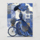 This unique image features a graceful lady in a vast blue hat and dress, riding a bicycle against a backdrop of blue and white ceramic tiles. Her flowing skirt and large floral adornments are rendered in a luxurious, patterned style with gold accents. The inclusion of the bicycle juxtaposes a modern element with the Delft-inspired Dutch aesthetic, creating a beautiful blend of historical fantasy and modern elegance.