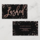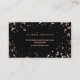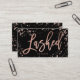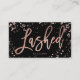 A modern, stylish Lashed lashes, eyes makeup artist business card with modern hand lettering style brush typography in faux rose gold foil on a rose gold confetti splatters with customisable black background.