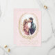 This pink save the date is perfect for announcing your upcoming wedding date. The design features an antique laurel wreath frame around your engagement photo. The design is on a light pink damask background.