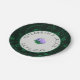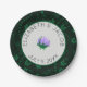 Paper plates featuring graphic-style Lavender camellia flower, off white background with a green border, and a floral background. Text is customisable. Look for matching wedding products.