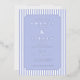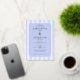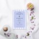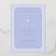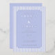 This elegant wedding invitation features a classic design with vertical blue and white stripes, creating a balanced and sophisticated background. The soft lavender colour palette adds a serene touch, while the centred ornate border frames the text beautifully. With a formal serif font, the invitation highlights the names of the couple as the focal point, surrounded by essential event details. Its clean layout and generous spacing ensure clarity and readability, making it perfect for a timeless and refined celebration.