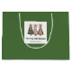Minimalist watercolor christmas tree gift bag with playful leopard pattern in earthy green and gold. Personalise with your custom name for a stylish Christmas gift presentation.