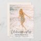 A modern, minimalist full photo order of service funeral program to celebrate the life of your loved one in a minimalist clean simple design style featuring a elegant handwritten script font and a soft pastel peach background. The design template can easily be personalised with your own photo and text to create a special tribute for your loved one's funeral, memorial or celebration of life. The image shown is for illustration purposes only to be replaced with your own photo. The placeholder image shows a happy young woman with wavy long blonde hair wearing an elegant chic pastel floral summer dress standing in the sea at sunset on a sandy beach in the shallow breaking waves. #funeral #orderofservice
