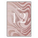 An elegant liquid rose gold background wedding table number 3.5x5inch sign featuring a whimsical gold background with bold table numbers and couple's monograms.