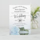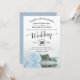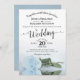 This gorgeous wedding invitation features a modern floral design with a single long stemmed dusty blue or light powder blue coloured rose lying on its side reflecting in a pool with waves and ripples. The design is simple, elegant, romantic and sophisticated, with lacy script calligraphy and fully customisable content.