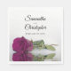 These beautiful wedding napkins will add style and class to your reception, rehearsal dinner, or other wedding related event. They feature a simple yet elegant and romantic design with a single long-stemmed cassis purple, magenta, or berry coloured rose reflecting in a pool of water with waves and ripples. Above the rose are the names of the couple and wedding date.