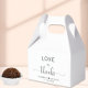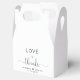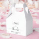 Elegant wedding favour box featuring "love + thanks" in simple modern typography and a stylish script, your first names joined together by a heart and your wedding date.