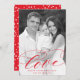 Elegant Valentine's day card featuring your vertical photo with "love" displayed in a red calligraphy script with an optional white gradient. Personalise the Valentine's day photo card with a custom greeting and your name. The photo Valentine's day card reverses to display a playful red and white heart pattern.
