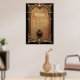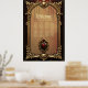 Elegant luxurious heart emblem. The design features an ornate, arched golden frame against a gradient brown background. The frame is highly detailed with baroque-style flourishes. Hanging from the top of the arch are delicate golden chains with teardrop pendants. At the bottom centre, a smaller, similarly styled golden frame displays a red heart emblem flanked by winged serpents. The overall mood is luxurious and decorative.