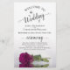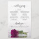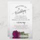These wedding programs are elegant and tasteful, while still being budget friendly. The design features a single long-stemmed cassis purple, magenta, or berry coloured rose lying on its side, reflecting in a pool of water with waves and ripples. The typography features lacy black script calligraphy, and there is room for details on the ceremony, the bridal party, and a short thank you.