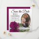 These beautiful save the date cards are the perfect way to let your friends and family know about your upcoming wedding. They feature a floral design that is both modern and elegant with a single long stemmed cassis purple or magenta plum, or dark mauve pink coloured rose reflecting in a pool of water with waves and ripples with your photo in an oval shaped frame on a classic white background. The caption reads Save the Date with space for your names, the date, and location. The back is a marbled magenta colour.