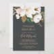 This elegant magnolia black and white Bat Mitzvah invitation is perfect for a modern classy bat mitzvah. The moody floral design features watercolor blush pink peonies, stunning white magnolia flowers and cotton with gold and green leaves in a luxurious arrangement on a dark background.