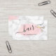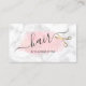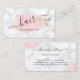 Modern and elegant business cards for hairstylists with faux gold scissors, pink watercolor, white marble texture and elegant calligraphy font.