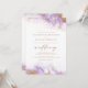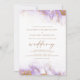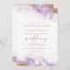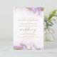 This elegant wedding invitation features a lavender watercolor border design in imitation of marble veined with faux gold foil, fading gradually into the white background. The word "wedding" appears in gold-coloured handwriting script, with the remaining text in gold-coloured serif capitals. The reverse side provides space for wedding details, along with a QR code guests can scan to visit your website and RSVP, which saves the cost of printing and mailing separate RSVP cards.