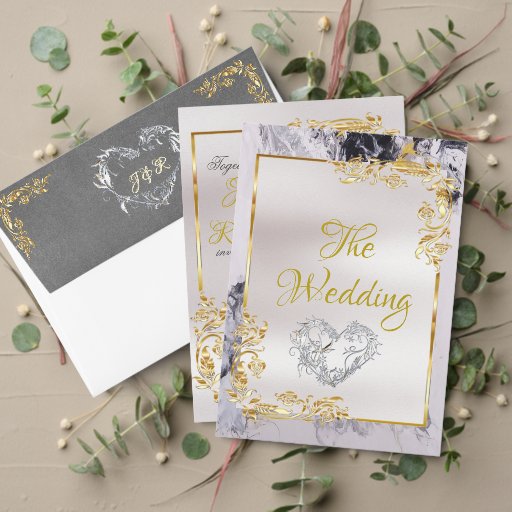 This elegant wedding announcement features a white satin center on a black and white marble background, framed with gold roses and leaves, embellished with a gold scroll heart. Designed to coordinate with the "Elegant Marble, Gold Leaves Frame & Scroll Heart" Wedding Collection. To change details, click «Personalize». To move the text or change the text size, font, or color click «Click to customize further»
