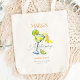 The bachelorette weekend tote bag showcases a vibrant watercolor margarita glass and lime slice on the left, perfectly capturing the "Margs & Matrimony" theme. The design embraces a minimalist style, with colourful accents that balance fun and elegance, reflecting the celebratory tone of the event.