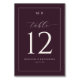 This elegant wedding table card features a deep maroon background with crisp white text, creating a sophisticated and formal atmosphere. The design showcases a clean serif font for the initials "M" and "K," complemented by an elegant cursive script for the word "table." Dominating the centre is the bold number "12," ensuring easy identification of your seating arrangement. Customisable placeholders allow for personalisation with names and dates, making it perfect for adding a personalised touch to your special day. The minimalist yet refined aesthetic makes this card ideal for weddings seeking a classic and polished look.
